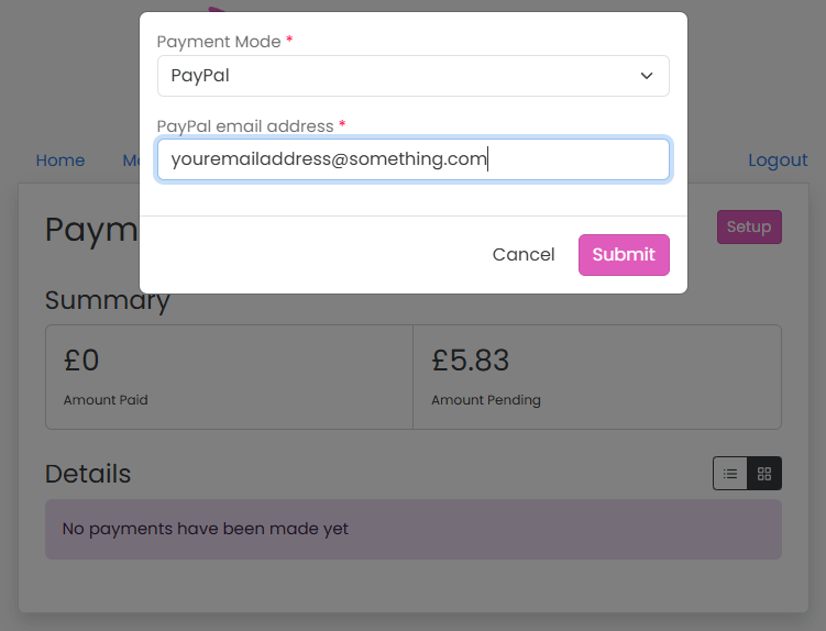 Then just drop down the list, choose PayPal (or bank), enter your PayPal email address (or acc no.) and press/click Submit.